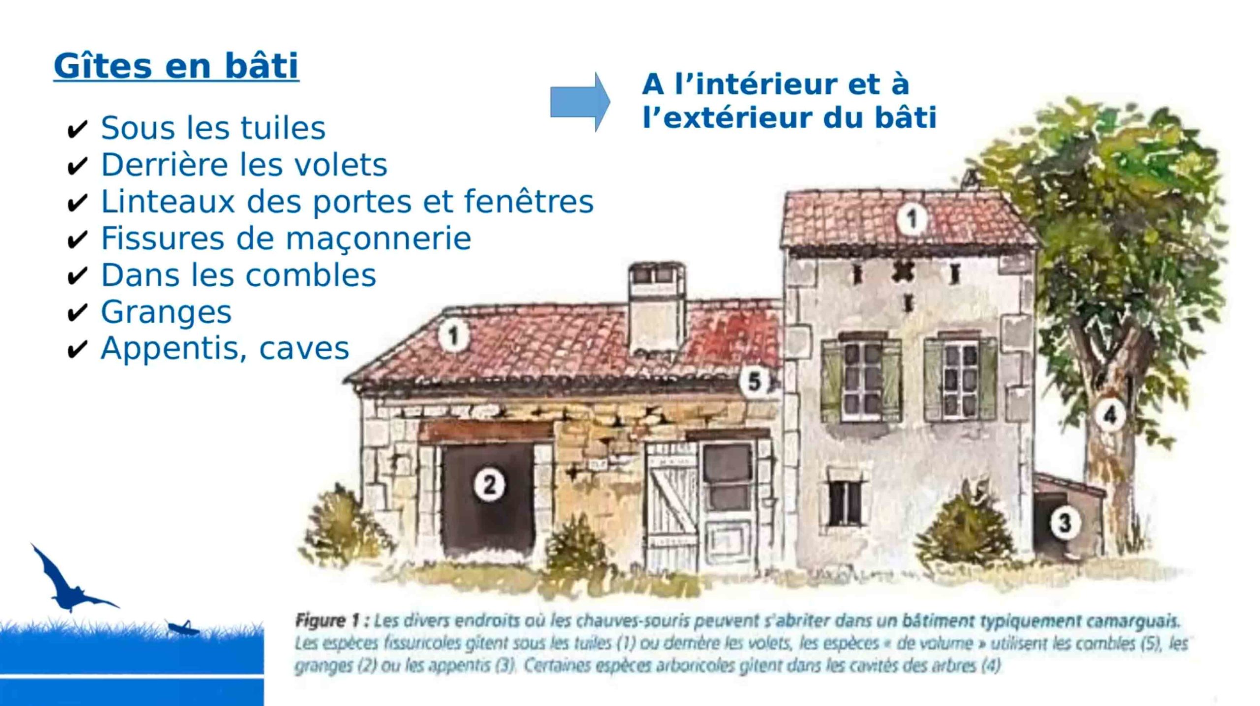 En journée, les chiroptères peuvent bien sûr se réfugier dans des grottes, mais pas seulement ! On les trouve aussi dans les ponts, les arbres, les greniers, derrière les volets qui restent ouverts, les caves et aussi les nichoirs spécifiquement conçus pour eux. Chaque espèce a ses petites exigences spécifiques.