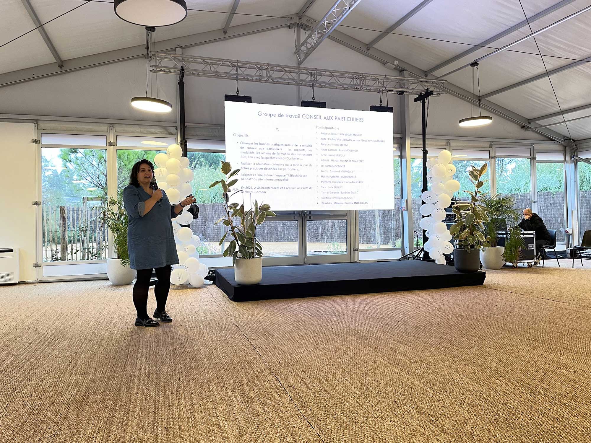 Mardi 15 octobre 2024 – Matinée d’échanges au camping Les Sablons, à Portiragnes-Plage, introduite par Julie GARCIN SAUDO, présidente du CAUE 34, conseillère départementale du canton de Pézenas, puis Philippe LABAUME, délégué régional, et Fabienne RODRIGUEZ de l’Union régional des CAUE d’Occitanie, pour la présentation des actions portées par les groupes de travail de l’union régionale.