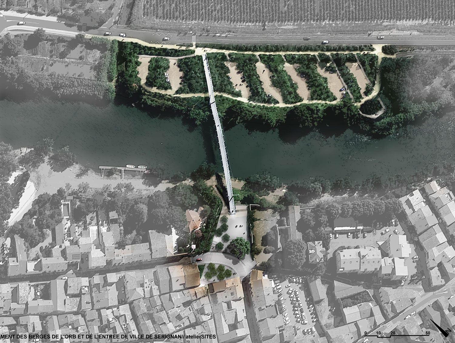 - Situation du projet au bord de l’Orb, face à la ville