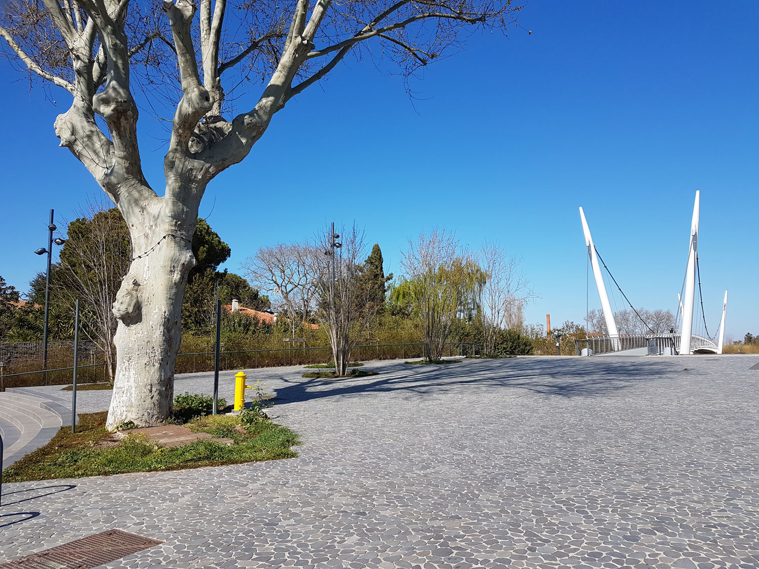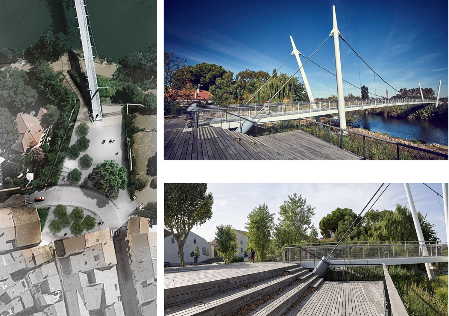 Le CAUE de l’Hérault a accompagné la commune lors de la définition du rédaction du cahier des charges pour l’aménagement de l’espace public sur l’espace public et les abords de la passerelle en mettant en avant les enjeux et contraintes techniques, environnementales et patrimoniales. Les travaux ont commencé en 2011 et se sont achevés en 2017. Le parking d’une capacité de 150 places déleste le stationnement en ville et offre le long des berges l’Orb une promenade.