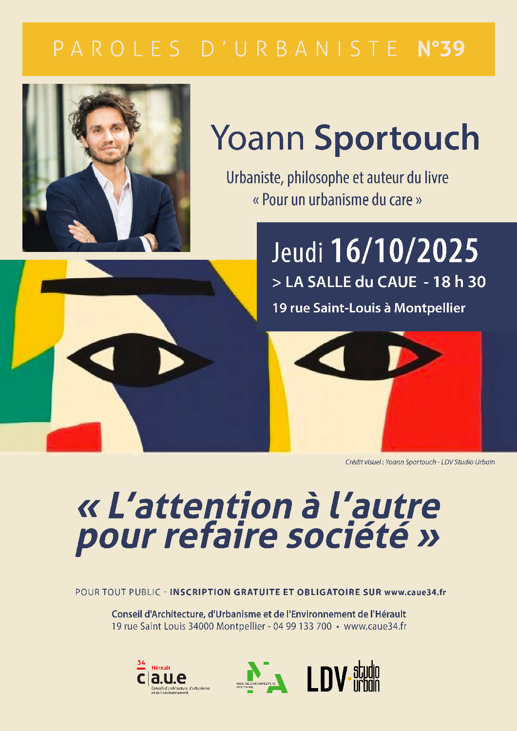 Prendre soin des lieux où l’on vit, où l’on travaille, où l’on se déplace et où l’on se détend : c’est là tout l’enjeu de cette nouvelle rencontre « Paroles d’expert » organisée par le CAUE34. Avec Yoann Sportouch, nous explorerons ensemble une question au cœur de l’actualité : pourquoi penser aujourd’hui un urbanisme du care, un urbanisme de l’attention et du soin ?